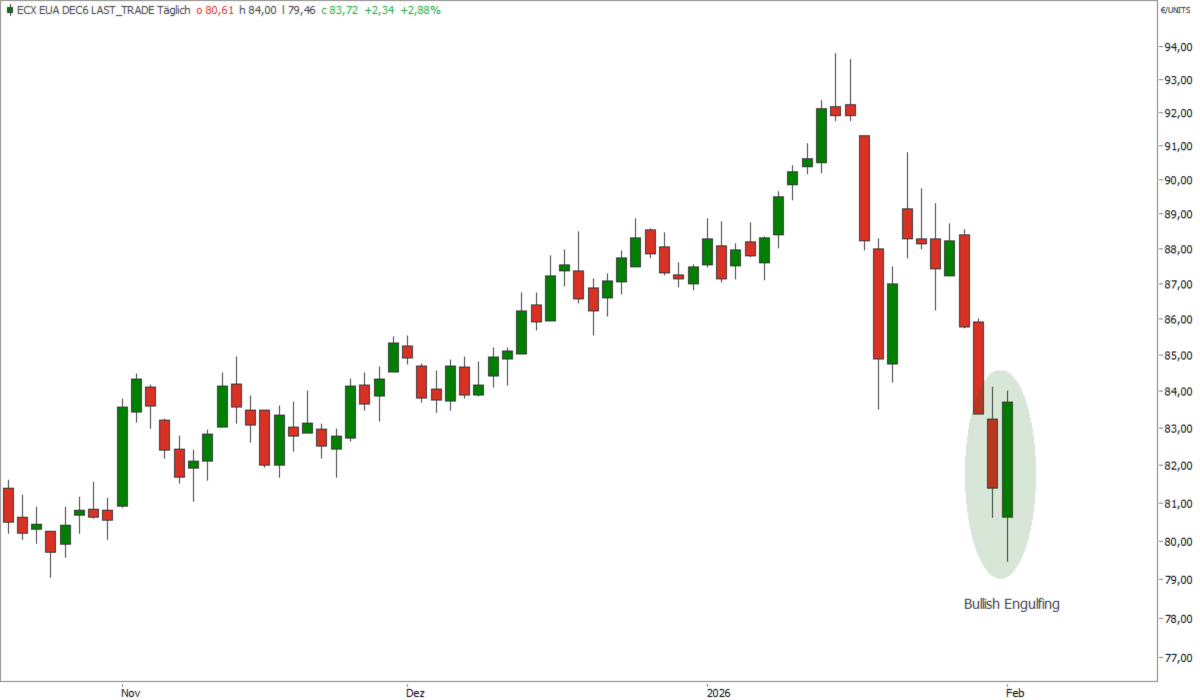 Ein “Bullish Engulfing” signalisiert häufig eine kurzfristige Trendumkehr, da es verdeutlicht, dass die EUA-Käufer die Kontrolle vom zuvor dominierenden Bärenlager übernommen haben. Die Kombination aus diesem Umkehrsignal und der starken Unterstützungszone erhöht die Wahrscheinlichkeit, dass im kurzfristigen Zeitfenster eine Erholungsphase anläuft. Candlestick-Umkehr-Formationen, wie das "Bullish Engulfing", offenbaren einen kurzfristigen Stimmungsumschwung von bearish zu bullish unter den Marktteilnehmern. Sie sind ein wichtiges, wenn nicht sogar unverzichtbares Werkzeug gerade im Swing-Trading.