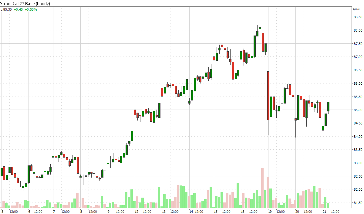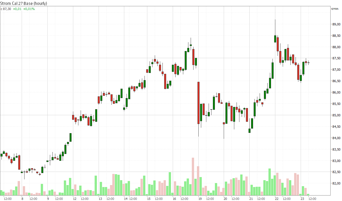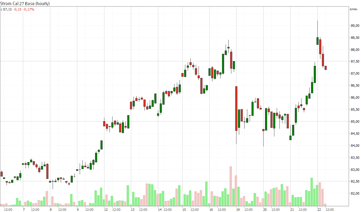 Am gestrigen Mittwoch beendete das Strom Frontjahr Base den Handelstag mit einem Plus von 3,1 Prozent bei 87,30 Euro/MWh. Am heutigen Donnerstag um 10:30 Uhr notiert das Strom Cal 27 Base 0,1 Prozent leichter bei 87,23 Euro/MWh. Ein Streik von EDF-Beschäftigten reduziert die französische Kernkraftleistung am Donnerstag um 530 MW. Betroffen ist der Reaktor Paluel 3, dessen Leistung vorübergehend auf 800 MW gedrosselt wurde. Hintergrund sind ungelöste Tarifkonflikte, Gewerkschaften warnen vor weiteren Streiks.
