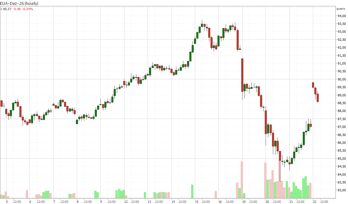 Die Verschmutzungsrechte gingen am gestrigen Montag mit einem Minus von 4,0 Prozent bei 88,22 Euro/t CO2 aus dem Handel. Am heutigen Dienstag um 10:35 Uhr notiert der EUA-Dezember-26-Kontrakt 1,9 Prozent schwächer bei 86,59 Euro/t CO2. Nach charttechnischen Signalen in Form von zwei Shooting-Stars am vergangenen Donnerstag und Freitag hält der Verkaufsdruck bei den CO2-Zertifikaten weiter an.