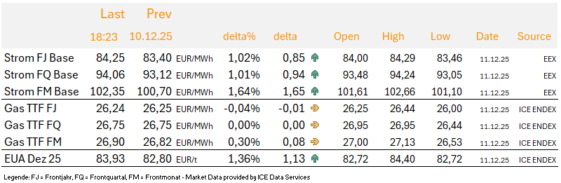 Am Donnerstag haben sich die Notierungen am Gas-Terminmarkt auf Schlusskursbasis kaum bewegt. Die EUAs haben 1,4 Prozent zugelegt und damit auch den Strommarkt nach oben gezogen. Auffällig war einmal mehr, dass die EUAs gegen 15 Uhr, mit Eröffnung der Börsen in den USA, einen Preisschub nach oben erfuhren. Die Wetterprognosen haben sich nicht merklich verändert und auch beim Gasangebot hat es keine größeren Veränderungen gegeben.