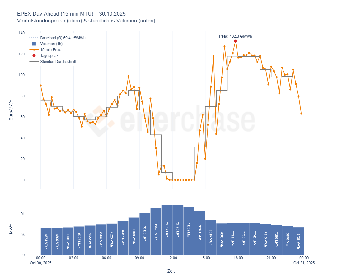 Die heutige Auktion für den Liefertag 30. Oktober ergab eine Baseload von 69,41 Euro/MWh und eine Peakload von 61,81 Euro/MWh. Das Tagesminimum lag bei −0,04 Euro/MWh, das Maximum bei 132,35 Euro/MWh bei einem Handelsvolumen von rund 810.806 MWh. Diese Konstellation steht für spürbaren Druck auf den Day-Ahead-Markt, ausgelöst durch neue, kurzfristig präzisere EE-Prognosen. Noch vor wenigen Tagen war am Markt ein knapperes Windangebot eingepreist.
