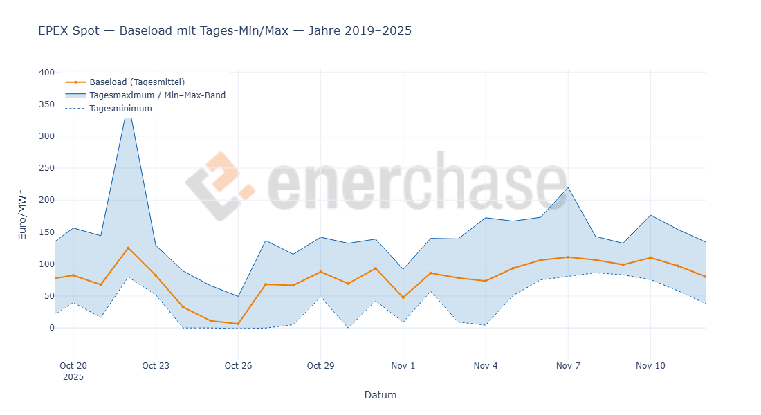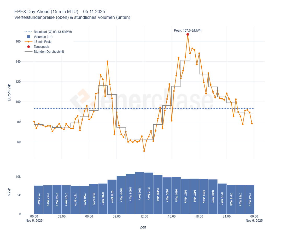 Die Spotauktion für den 5. November ergab eine Baseload von 93,43 Euro/MWh und eine Peakload von 99,06 Euro/MWh. Die günstigste Viertelstunde lag mittags um 12:00 bei 50,89 Euro/MWh, das Tageshoch wurde um 16:45 mit 167,03 Euro/MWh erreicht. Damit zeigt sich ein klarer Tagesrhythmus mit einem weichen Preistal am späten Vormittag und einer ausgeprägten Abendspitze ab etwa 16:00. Besonders günstig waren die Mittagsviertelstunden, in denen auch die größten Strommengen gehandelt wurden, weil gleichzeitig viel Wind- und Solarstrom ins Netz kam. Am späten Nachmittag steigen die Preise rasch an, wenn die Sonne untergeht und der Bedarf aus Haushalten, Beleuchtung und Industrie hoch bleibt. Insgesamt ist für morgen im Intraday mit moderaten Durchschnittspreisen zu rechnen, allerdings mit möglichen Ausschlägen am Abendpeak.
