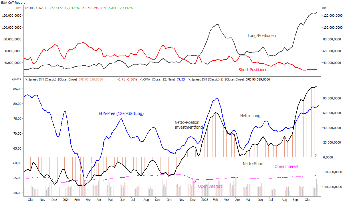 Kurzfristig wirkt die neue Flexibilität preisdämpfend: Ein Teil der Minderung verlagert sich ins Ausland, und die spätere ETS2-Einführung verzögert zusätzliche Nachfrage. Allerdings geht es um das Klimaschutzziel 2040, so dass der Effekt mittelfristig begrenzt ist. Entscheidender bleibt die starke Nachfrage der Spekulanten. Selbst die Aufweichung des Klimaschutzziels reicht offensichtlich nicht für eine Reduzierung der rekordhohen Long-Position der Investmentfonds aus. Zudem sind die Preise des EU-ETS2 bereits im Oktober stark gefallen, als die geplanten Maßnahmen gegen zu hohe Kosten publik wurden, und seitdem haben sich die Futures wieder spürbar erholt.