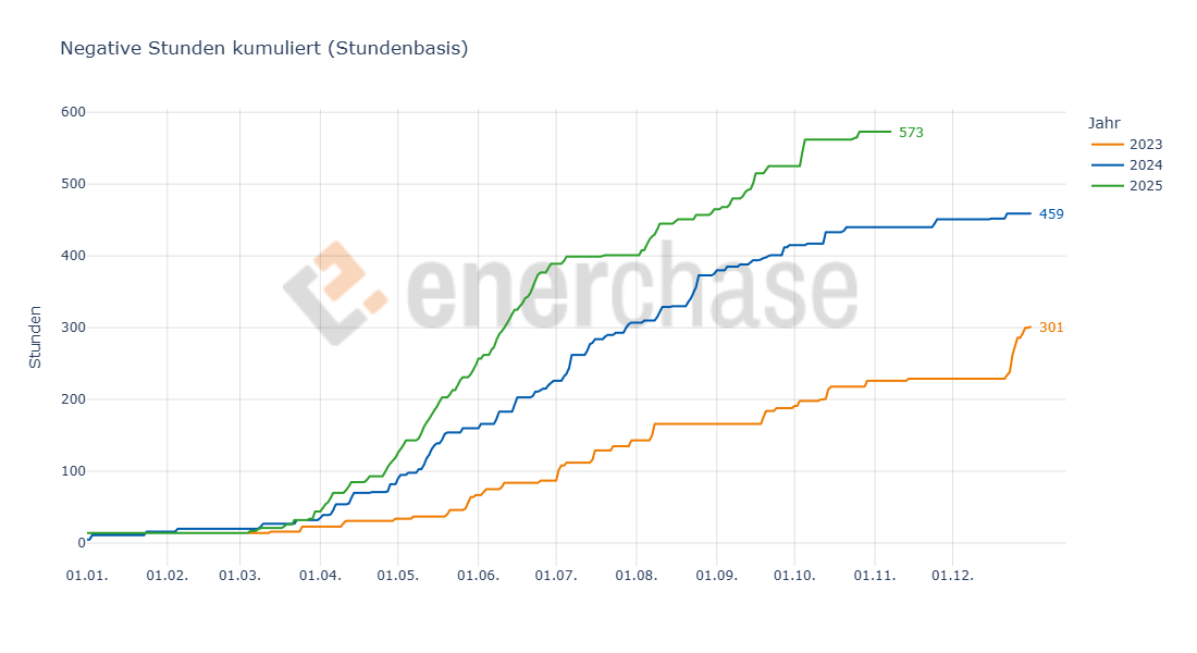 - 2025 liegt mit rund 573 negativen Stunden und 655 Stunden inklusive Nullpreise bereits deutlich über den Vergleichsjahren 2023 (301/325 Stunden) und 2024 (459/521 Stunden).