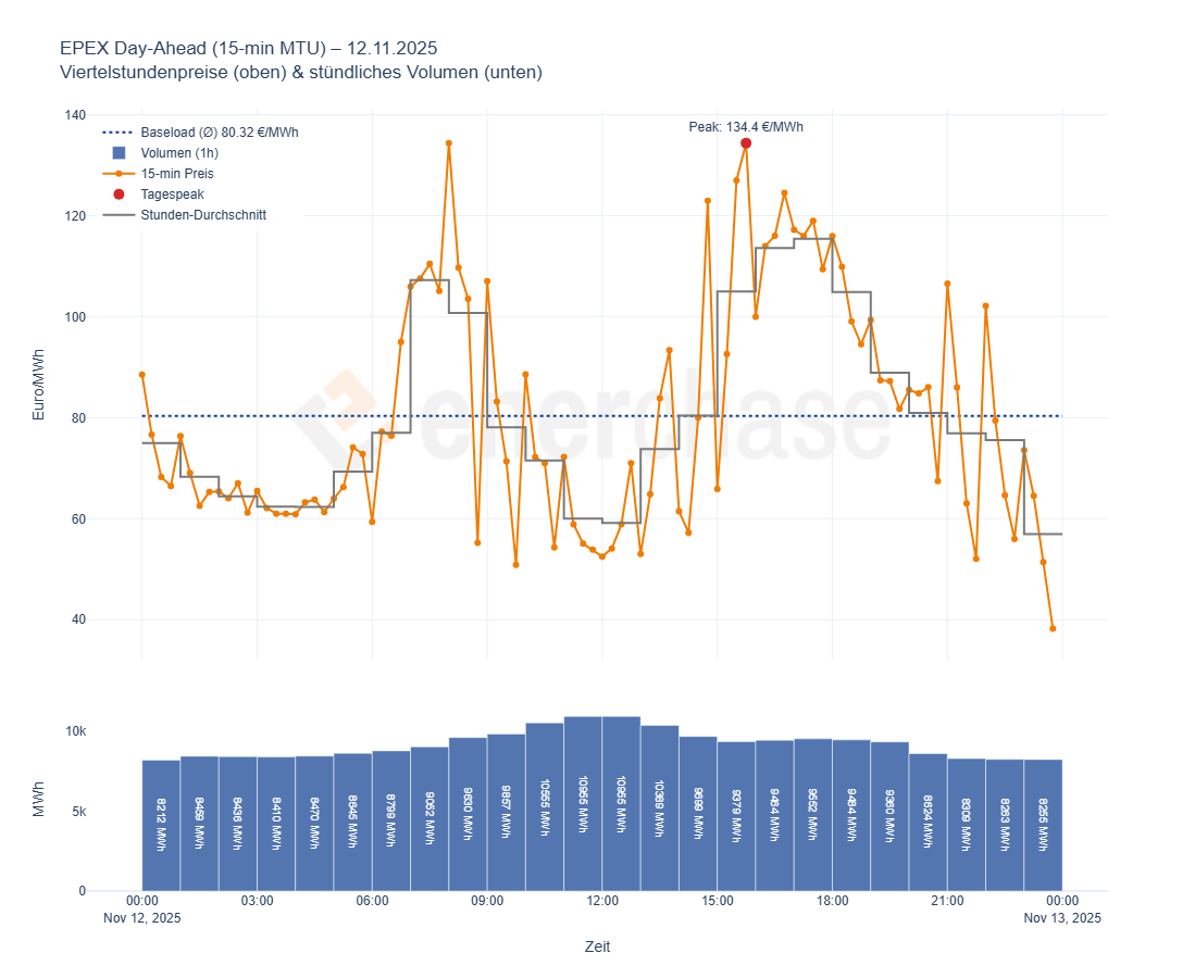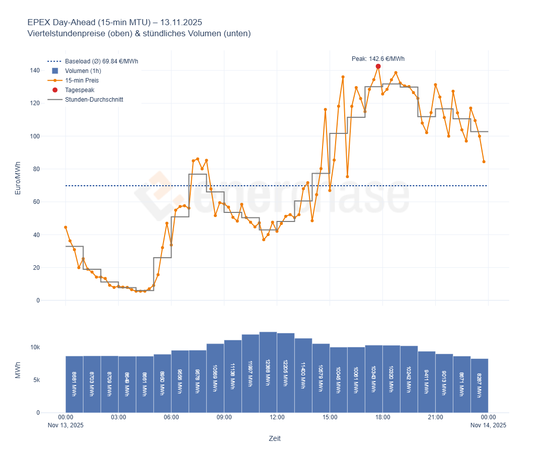Die jüngste Aufwärtsrevision der Windprognosen hat die Day-Ahead-Preise spürbar gedrückt und das zeigt sich in der Spotauktion für Donnerstag mit einer Baseload von 69,84 Euro/MWh. Am 13.11. sorgt reichlich Wind mit rund 28 Gigawatt im Tagesmittel und solide PV zur Mittagszeit für eine deutlich niedrigere Residuallast. Der Viertelstundenverlauf beginnt mit einem sehr günstigen Nacht- und Frühmorgental mit Tiefstwerten knapp über Null, es folgt ein kurzer Morgenspike um etwa 08:30 bis rund 85 Euro/MWh und danach eine erneute Entspannung bis in den frühen Nachmittag. Ab etwa 15:30 setzt eine steile Abendrampe ein, der Tagespeak erreicht 142,6 Euro/MWh und die Preise bleiben anschließend bis spät abends meist über 100 Euro/MWh. Die höchsten Volumina fallen in die Mittagsstunden, getrieben durch die Erneuerbaren, was den Peak-Preisfloor in diesem Fenster merklich drückt.