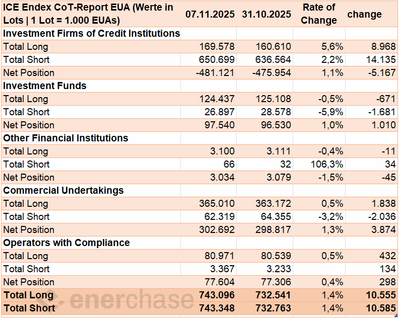 Die aktuellen CoT-Daten der ICE-Endex per 07.11.2025 zeigen einen leichten Positionsrückgang bei den Investmentfonds. Die Long-Position verringerte sich gegenüber der Vorwoche um 0,7 Mio. EUA auf 124,4 Mio. EUA (minus 0,5 Prozent). Gleichzeitig reduzierten die Fonds auch ihre Short-Positionen um 1,7 Mio. EUA auf 26,9 Mio. EUA (minus 5,9 Prozent). In der Summe ergab sich dadurch eine geringfügige Ausweitung der Netto-Long-Position auf 97,5 Mio. EUA, was einem Anstieg um 1,0 Prozent entspricht.