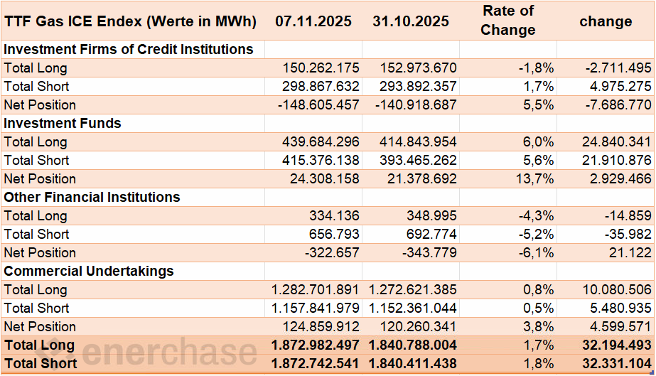 Die aktuellen CoT-Daten der ICE Endex per 07.11.2025 zeigen eine leichte Wiederbelebung der spekulativen Aktivität im TTF-Gasmarkt. Die Investmentfonds haben sowohl ihre Long- als auch ihre Short-Positionen spürbar ausgeweitet, wobei der Long-Aufbau mit einem Plus von 24,8 TWh auf 439,7 TWh (plus 6,0 Prozent) etwas stärker ausfiel als der Anstieg der Short-Seite um 21,9 TWh auf 415,4 TWh (plus 5,6 Prozent). In der Summe erhöhte sich die Netto-Long-Position der Fonds damit moderat um 2,9 TWh auf 24,3 TWh (plus 13,7 Prozent).
