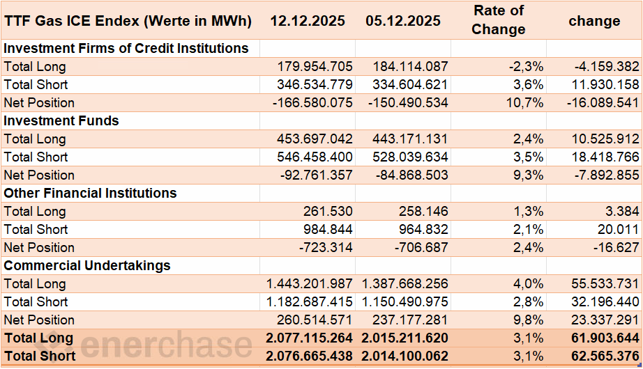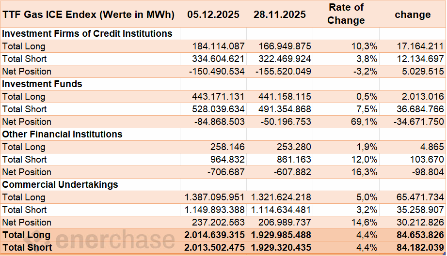 Die aktuellen CoT-Daten der ICE Endex per 05.12.2025 offenbaren eine Fortsetzung der bearishen Positionierung am Gasmarkt. Die Investmentfonds haben ihre Netto-Short-Position binnen einer Woche um fast 70 Prozent ausgeweitet. Diese aggressive Positionierung korrespondiert mit der anhaltend schwachen Preisentwicklung im TTF Gas Cal 26, das in der Berichtswoche um 3,1 Prozent nachgab. Die fundamentale Schwäche des Gasmarkts durch hohes Angebot und nun milde Witterung veranlasst die Spekulanten zu einer der deutlichsten Positionierungen auf der Netto-Short-Seite der jüngeren Vergangenheit.