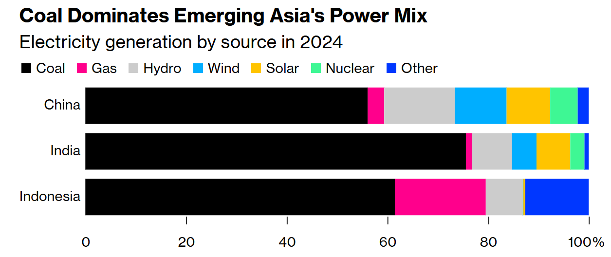 Der Übergang zu sauberer Energie in Asien gerät derzeit ins Stocken, vielmehr sieht die Zukunft von Kohle in Asien vielversprechender aus. Während Europa seinen Kohleausstieg vorantreibt, vollzieht sich in den größten Volkswirtschaften des Kontinents laut Bloomberg eine Kehrtwende: Indonesien hat die geplante Frühstilllegung des Prestigeprojekts Cirebon-1 gekippt, Indien diskutiert eine Verlängerung des Kohleausbaus bis Mitte des Jahrhunderts, ursprünglich war 2035 als Enddatum vorgesehen. Die indische Kohlekapazität könnte laut dem Artikel bis 2047 um 87 Prozent steigen und bis 2047 420 GW erreichen. China bereitet sich derweil auf das nächste Rekordproduktionsjahr vor. Für 2025 sind in China Neuinstallationen von 80 GW geplant, die höchste Rate seit zehn Jahren. Analysen des Centre for Research on Energy and Clean Air zeigen: Diese drei Staaten tragen überproportional zum Emissionsanstieg seit Paris 2015 bei. Ohne deren Kohleexpansion hätten globale Energieemissionen bereits 2020 ihren Höhepunkt erreicht. Die beigefügte Grafik verdeutlicht: Fossile Brennstoffe beherrschen nach wie vor die Stromversorgung der Region.