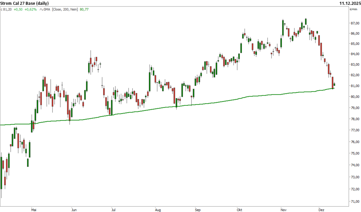 Nach dem kräftigen Kursrutsch der jüngsten Vergangenheit ist das Strom Cal 27 Base auf den wichtigen 200-Tage-Durchschnitt zurückgefallen. Diese Marke hat in den letzten Monaten mehrfach als Unterstützung gehalten, sodass hier mit Kaufinteresse zu rechnen ist. Sollte den Strombären ein nachhaltiger Kursrutsch unter diese Marke gelingen, wäre dies ein bearishes Signal. Der gleitende 200-Tage-Durchschnitt ist für die Charttechnik von besonderer Bedeutung, da er als klassische Trennlinie zwischen Bullen- und Bärenmarkt gilt.