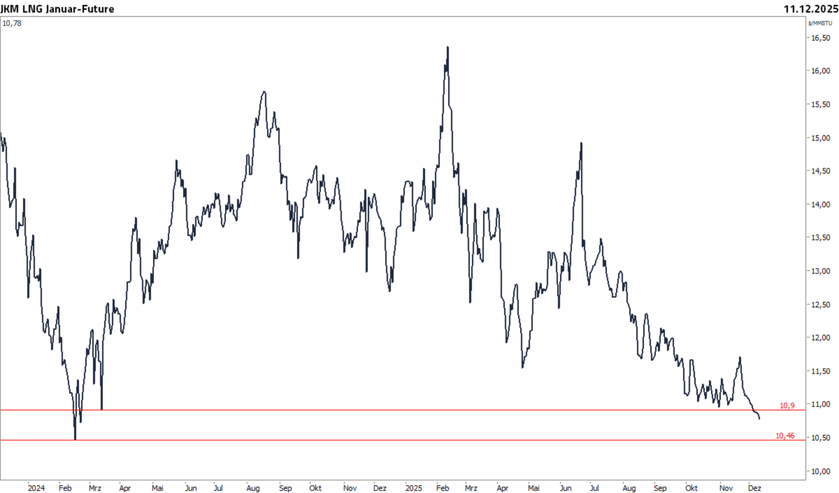 Im Einklang mit dem europäischen TTF Gas nähert sich auch der asiatische Leitkontrakt JKM seinen Tiefpunkten aus Februar 2024. Der JKM-Januar-Future hat das März-Tief unterschritten und nähert sich nun seinem Tiefpunkt aus Februar 2024 bei 10,46 US-Dollar/MMBtu. Hintergrund der anhaltenden Kursschwäche bleibt neben dem hohen Angebot insbesondere die Nachfrageschwäche, was auch auf milde Temperaturen zurückzuführen ist. Trotz einer Stabilisierung der chinesischen LNG-Importe im November sind es besonders China und Japan, die die Nachfrageschwäche untermauern. Auch kühlere Sommertemperaturen in Indien und ein wachsender Anteil an Kernenergie senken die Nachfrage nach LNG, während Bangladesch bei günstigen Spotmarktpreisen mehr kaufte. Der Effekt ist aber begrenzt. Aufgrund des steigenden Angebots im Jahr 2026 dürfte die Preisschwäche auch in 2026 anhalten. Laut einem Bericht der IEEFA wird die LNG-Nachfrage in Asien 2025 voraussichtlich um fünf Prozent sinken, der stärkste Rückgang seit 2022. Die anhaltende Schwäche Chinas könnte außerdem dazu führen, dass Japan wieder zum weltweit größten LNG-Importeur wird.