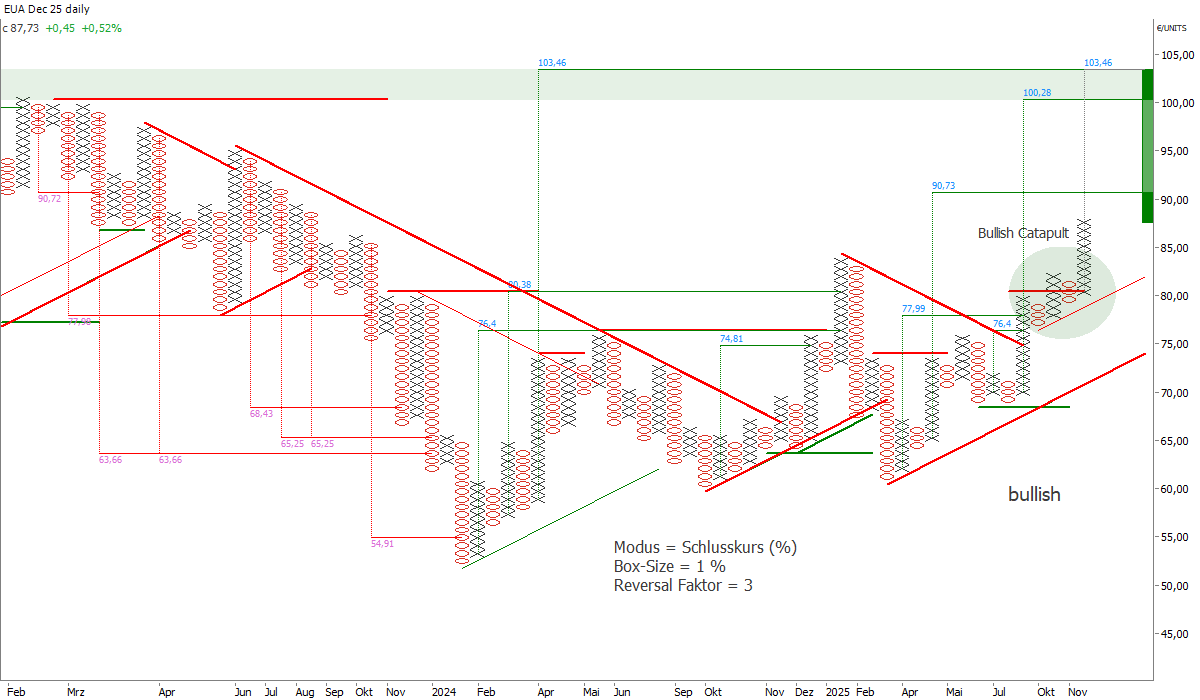 Nach einer "Bullish Catapult" Formation im Point & Figure Chart befindet sich der EUA-Dez-Future seit Ende November in einer ungebremsten Rally. Das Kursziel im Bereich der 90-Euro-Marke bleibt weiter aktiviert. Weitere aus der vertikalen Messmethode ableitbare Kursziele liegen im Bereich 100 Euro/t CO2.
