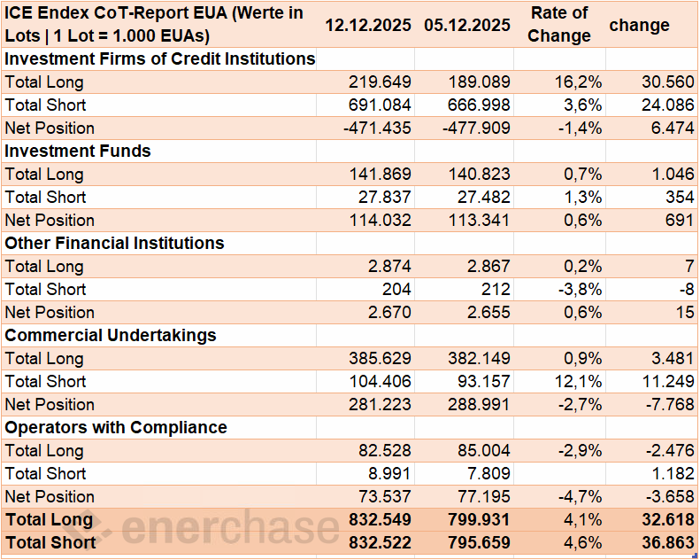 Die heute veröffentlichten CoT-Daten der ICE Endex per 28.11.2025 bestätigen die Erwartungen. Angesichts des Kursanstiegs von 3,3 Prozent im EUA-Dez-25-Future in der Berichtswoche zeigt der Report, dass die Spekulanten ihre bullishe Ausrichtung weiter ausgebaut haben. Die Investmentfonds setzen ihren Long-Aufbau nach einer kurzen Konsolidierungspause fort und fungieren damit als wesentliche Preisstütze für die CO2-Zertifikate.