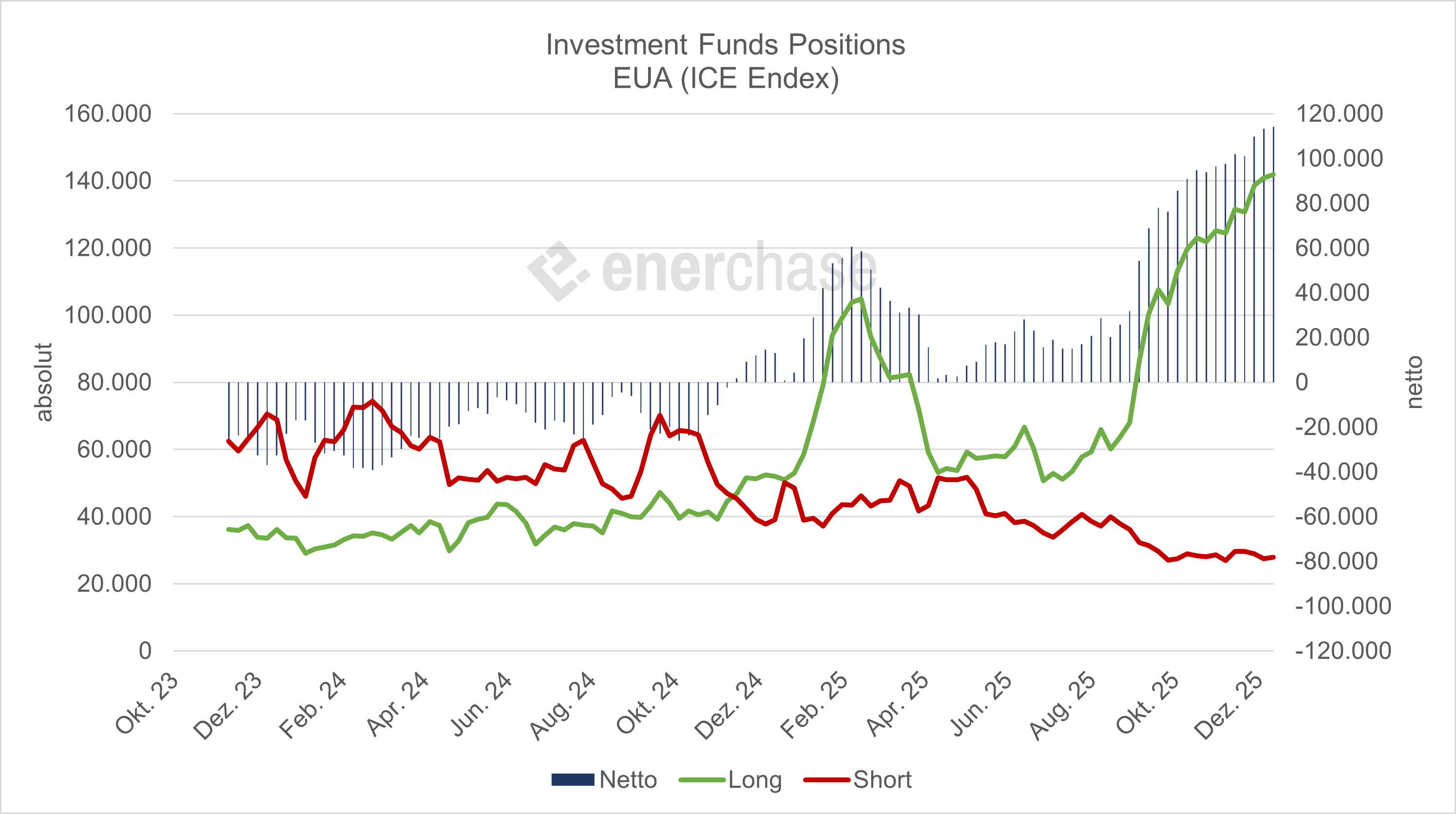 Gleichzeitig bleibt die absolute Höhe der Netto-Long-Position bemerkenswert: Mit rund 101 Mio. EUA befinden sich die Investmentfonds weiterhin auf dem höchsten Stand der vergangenen Jahre. Dieser strukturelle Long-Bias wirkt stabilisierend, da er signalisiert, dass die Fonds trotz der kurzen Verschnaufpause nicht an ihrer grundsätzlichen Aufwärtsüberzeugung rütteln. Der Markt behält damit eine solide Unterstützung.