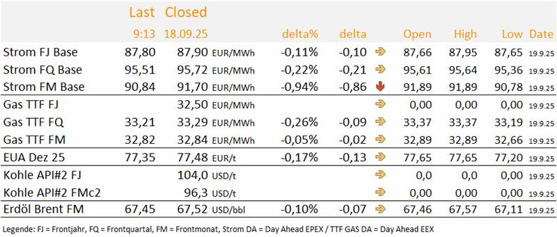 Die breite Zustimmung zu Trumps Gaza-Plänen lässt die geopolitischen Sorgen um den Nahen Osten zurückgehen. Auch wenn der Konflikt zwischen der Hamas und Israel in der Vergangenheit nicht den Anschein hatte, den Energiemarkt maßgeblich zu bewegen, könnte die Lösung des Konflikts ein Impuls sein, der den Ölmarkt fallen lässt. Dies hätte sicherlich auch Auswirkungen auf den Gasmarkt. Die kurzfristigen Ausfälle in Norwegen scheinen den Markt heute nicht sonderlich aus dem Konzept zu bringen. Die Ausfallzeiten sind überschaubar. Wegen der Umstellung auf Viertelstundenprodukte wird mit Spannung wird auf die Strom Spotmarktauktionen geblickt. Wir bleiben vorerst weiter neutral für Gas und Strom. Die EUAs sehen wir weiter bearish. Mehr dazu in unserem Fazit um 10 Uhr.