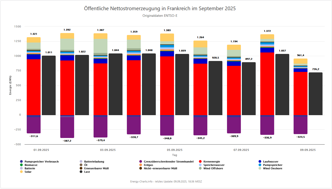 Der starke Anstieg der deutschen Nettoeinspeisung am 1. September ist auf eine Bilanzierungsmeldung von Uniper Energy Storage zurückzuführen. In den Kavernenspeichern UGS Etzel Erdgas Lager EGL und UGS Etzel ESE wurde technisch erforderliches Gas freigegeben, das bislang zur Sicherstellung der Speicherintegrität im laufenden Speicherjahr 2025/26 vorgehalten werden musste. Mit dem Fortschritt in der Vermarktung der Kapazitäten konnte dieses Gas nun bilanziell freigesetzt werden. Es handelt sich somit nicht um einen realen Erzeugungseffekt, sondern um eine einmalige technische Korrektur, die in den Daten als deutlicher Einspeisesprung sichtbar wird.