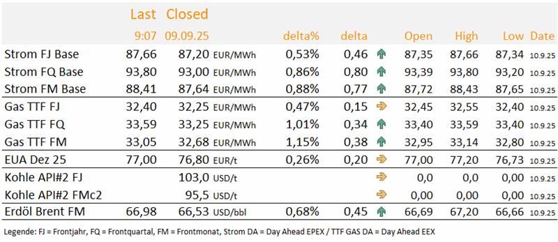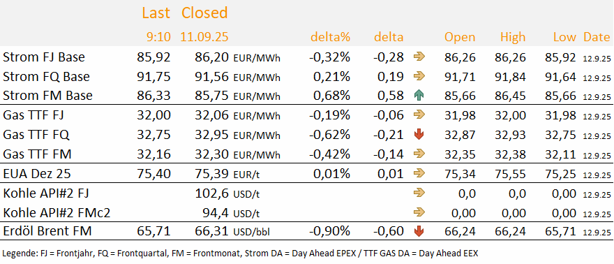 Übergeordnet hat sich an unserem bearishen Gesamtbild nicht viel verändert. Kurzfristig wirken aber offenbar einige bullishe Impulse, bei denen allerdings fraglich ist, wie lange sie tragen. Nach dem Ende des Sommers wird sich der Einfluss des Wetters verändern. Wie wird die Windverfügbarkeit im Herbst, wann beginnt die Heizsaison, wie sehen die Temperaturprognosen für den Oktober aus? Wir bleiben heute daher voraussichtlich neutral. Unsere finale Einschätzung finden Sie um 10 Uhr in unserem DailyReport Outlook.