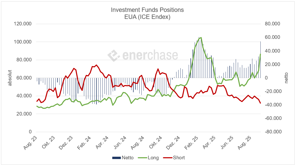 Für einen CO2-Händler an der Börse bleibt dies ein bullishes Signal. Investmentfonds gelten als Trendfolger und Liquiditätstreiber am EUA-Markt. Wenn sie ihre Long-Positionen so massiv ausbauen und gleichzeitig Shorts reduzieren, spricht das für ein wachsendes Vertrauen in steigende Preise. Ob diese Marktakteure ihre Käufe in den kommenden Wochen fortsetzen, ist angesichts des Ausmaßes der Positionierung jedoch in Frage zu stellen.