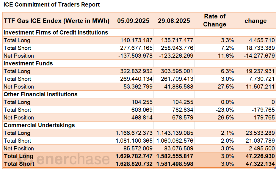 Das spekulative Kapital im TTF Gasmarkt nimmt wieder zu. Laut aktuellem CoT-Report erhöhten die Investmentfonds in der Woche zum 12.09.2025 die Long-Position um 6,4 Prozent auf 343 TWh. Die Short-Position erhöhte sich aber ebenfalls, und zwar um 6,1 Prozent auf 285 TWh. Damit stieg die Netto-Long-Position um 7,7 Prozent auf 57 TWh.