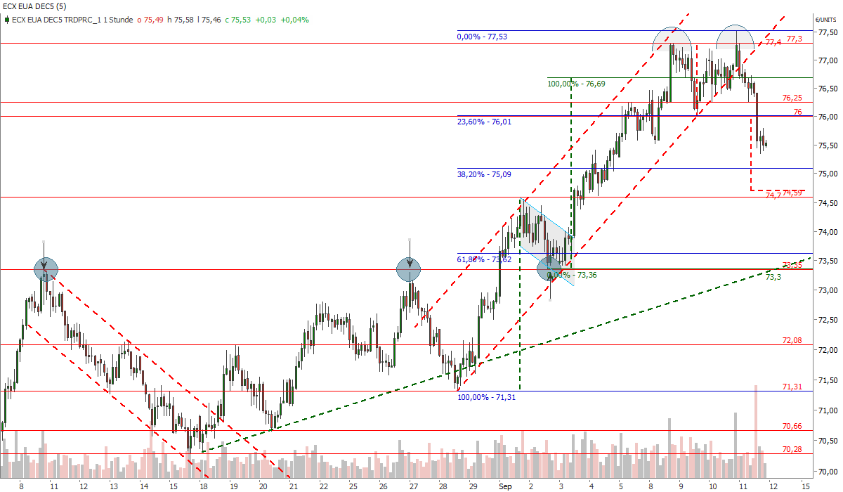 Die Charttechnik liefert mit dem komplettierten Doppeltop im Stundenchart (EUA-Dez-25) ein kurzfristiges Verkaufssignal (Abschlagspotenzial aufgrund der Formationshöhe rund 74,7 Euro/t CO2). Der Abverkauf geschah zudem unter einem hohen Handelsvolumen, was ein Zeichen für erhöhtes Verkaufsinteresse ist. Aufgrund der hohen Netto-Long-Position der Investmentfonds könnten die Preise für EUAs aufgrund von Gewinnmitnahmen auch noch weiter nachgeben.