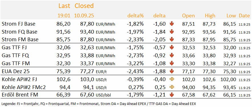Energy Market Drivers am 16.09.2025: Wind nimmt stetig ab und stützt das kurze Ende