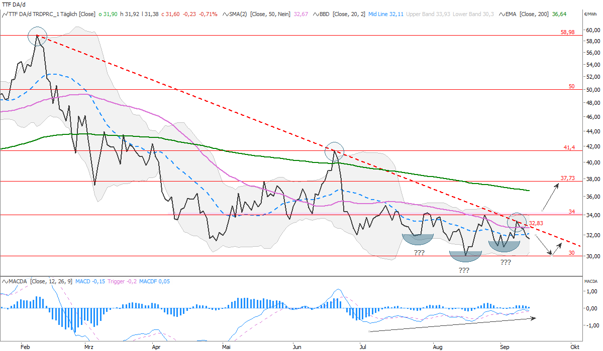 Der TTF Gas DA hat jüngst den langfristigen Abwärtstrend seit dem Februarhoch bei 58,98 Euro/MWh bestätigt. Die Notierung prallte zuletzt von der fallenden Trendgeraden ab, womit ein Test der 30-Euro-Marke wieder wahrscheinlich erscheint. Von hier aus ist mit stärkerem Kaufdruck zu rechnen, zumal sich in diesem Bereich auch das untere Bollinger Band (30,3 Euro/MWh) und das Tief von Mitte August befinden. Weiterhin besteht allerdings die Gefahr einer Bodenbildung in Form einer inversen Schulter-Kopf-Schulter-Formation (SKS). Diese wäre bestätigt, wenn der Kurs des TTF Gas DA über die Marke von 34 Euro/MWh (Nackenlinie) ansteigt. In diesem Fall ist ein Preisanstieg bis an die 200-Tage-Linie bei 36,64 Euro/MWh und bis auf rund 38 Euro/MWh zu erwarten. Die bullishe Divergenz des MACD im Vergleich zum Linienchart spricht weiterhin für eine Bodenbildung.