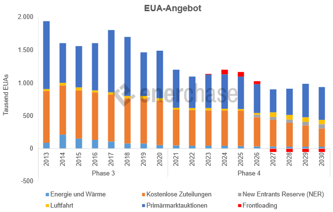 Bloomberg berichtet in dem Artikel Germany to Push EU to Extend Industry Free Permits to Emit CO2, dass Deutschland plant, die Europäische Union dazu zu drängen, die Regeln zur Emissionsminderung für die am stärksten verschmutzenden Industrien aufgrund gestiegener Energiekosten zu lockern. Die Regeln des EU-Emissionshandelssystems sollen ab dem nächsten Jahr verschärft werden. So werden die kostenlosen Zuteilungen von Emissionszertifikaten für den Luftfahrtsektor abgeschafft und bis 2034 für alle Industrien schrittweise beendet. In der Abbildung unten sieht man die sinkenden Zuteilungen in den Balken in Orange. Die deutsche Wirtschaftsministerin Katherina Reiche erklärte, das Land müsse mit der Europäischen Kommission eine Lösung finden, um die kostenlose Zuteilung zu verlängern – andernfalls drohe der Verlust essenzieller Industriezweige.