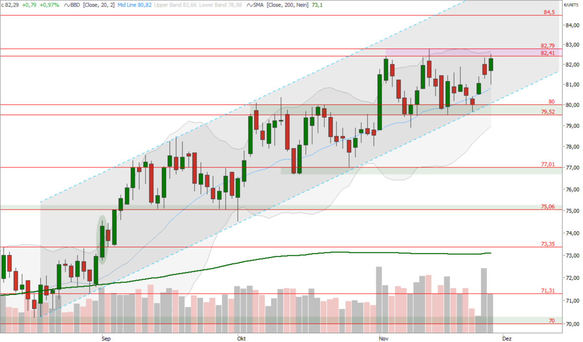 Ein Trendwechsel lässt sich daraus nicht ableiten. Die Investmentfonds bleiben insgesamt klar Netto-Long positioniert, wodurch der EUA-Markt weiterhin eine starke Unterstützung erfährt. In der aktuellen Handelswoche ging es entsprechend bis Donnerstagvormittag wieder dynamisch aufwärts, sodass das Vorwochenhoch temporär überwunden wurde (82,79 Euro/t CO2). Anschließend setzten jedoch wieder Kursrücksetzer ein, gegen 14 Uhr notiert der Dezember-Future bei rund 81,50 Euro/t CO2.