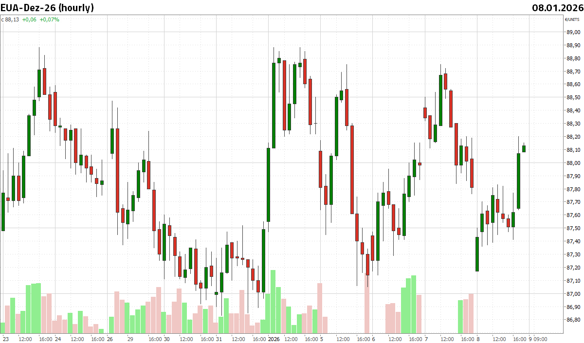 Über den Jahreswechsel zeigte der neue Leitkontrakt EUA-Dez-26 eine Seitwärtsbewegung zwischen 88,88 Euro/t CO2 auf der Ober- und 86,83 Euro/t CO2 auf der Unterseite und beendete die Handelswoche mit einem moderaten Plus von 0,5 Prozent. Zu Beginn der aktuellen Handelswoche haben die Energiemärkte am Montag deutlich schwächer geschlossen und die EUAs verloren 1,3 Prozent. Mit abkühlenden Temperaturprognosen stabilisierten sich die Notierungen aber wieder und handeln am Donnerstagnachmittag gegen 17 Uhr auf dem Niveau des Vorwochenschlusskurses.
