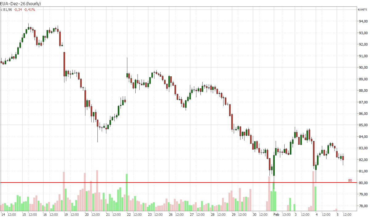 Nach dem kräftigen Verkaufsdruck zu Beginn der vergangenen Handelswoche 4 hatten sich die Notierungen des EUA-Dez-26-Futures im Wochenverlauf noch etwas stabilisiert. Dennoch blieb auf Wochensicht ein Kursverlust von 4,1 Prozent stehen. Nach einer Konsolidierung zu Wochenbeginn setzte sich der Verkaufsdruck in der zweiten Wochenhälfte weiter fort. Am Donnerstagnachmittag gegen 16 Uhr notiert das Emissionsrecht bei rund 84,5 Euro/t CO2. Interessant war bereits am Mittwoch, dass der EUA-Dez-26-Future in der letzten Handelsstunde nochmals deutlich unter Verkaufsdruck geraten ist. Dazu passt die jüngste Äußerung von Bundeswirtschaftsministerin Katherina Reiche auf dem Handelsblatt Energie-Gipfel am 27.01.: „Wir sind uns selbst mit dem Umweltministerium einig, dass wir das Thema kostenfreie Zuteilung weiterführen müssen, bis eine Alternative kommt.“ Um die Industrie wettbewerbsfähig zu halten, werde die Bundesregierung laut Reiche weiterhin kostenfreie CO2-Zertifikate an besonders energieintensive Unternehmen vergeben. Der EU-Grenzausgleich CBAM sei dafür aktuell noch zu bürokratisch und ineffizient. Vor dem Hintergrund, dass die EU-Kommission ihren Bericht zur Überprüfung des EU-Emissionshandelssystems bis zum 31. Juli 2026 dem Rat und dem Europäischen Parlament vorlegen muss, stellt dies eine klare Positionierung der deutschen Regierung als größte energieintensive Volkswirtschaft Europas dar. Weitere Äußerungen in dieser Richtung könnten auch die Investmentfonds mit ihrer rekordhohen Netto-Long-Position verunsichern. Ein Vorgeschmack auf die Auswirkungen eines Verkaufs lieferte bereits der Verlust in der Vorwoche, der mit einer Reduzierung der Netto-Long-Position um 10,7 Prozent oder 13,5 Mio. EUA bei den Investmentfonds einherging.