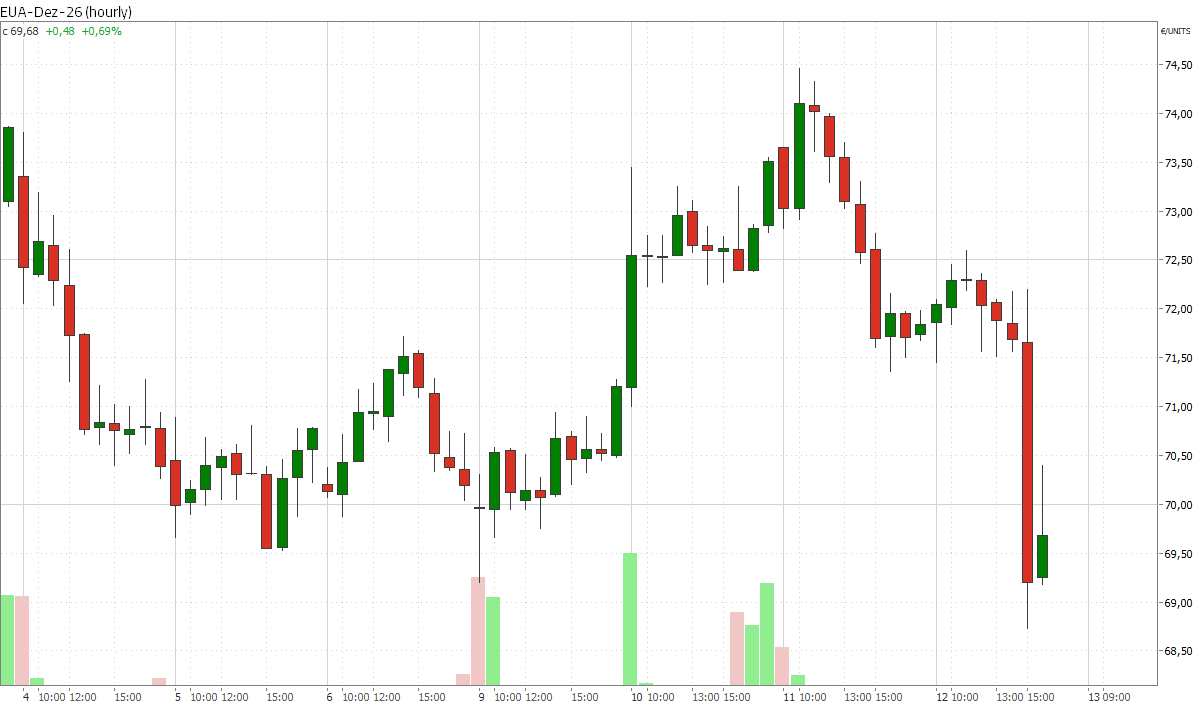 Hintergrund der Kursschwäche sind weitere kritische Aussagen führender EU-Politiker, nachdem zehn Mitgliedstaaten, darunter Deutschland, Frankreich und Italien, eine Überarbeitung des Emissionshandelssystems gefordert haben. Die Gruppe betont, dass die Dekarbonisierung nicht zu einer Deindustrialisierung führen dürfe. Verlangt wird mehr Wettbewerbsfähigkeit, Marktstabilität sowie Schutz vor übermäßiger Preisvolatilität und ein pragmatischerer Umgang mit kostenlosen Zertifikaten. Italiens Unternehmensminister brachte zudem eine mögliche Aussetzung des Systems ins Spiel – bis zu einer grundlegenden Reform der Emissionsbenchmarks, Zuteilungsmechanismen und des CO2-Grenzausgleichs. Dies übte zusätzlichen Druck auf die Preise aus.