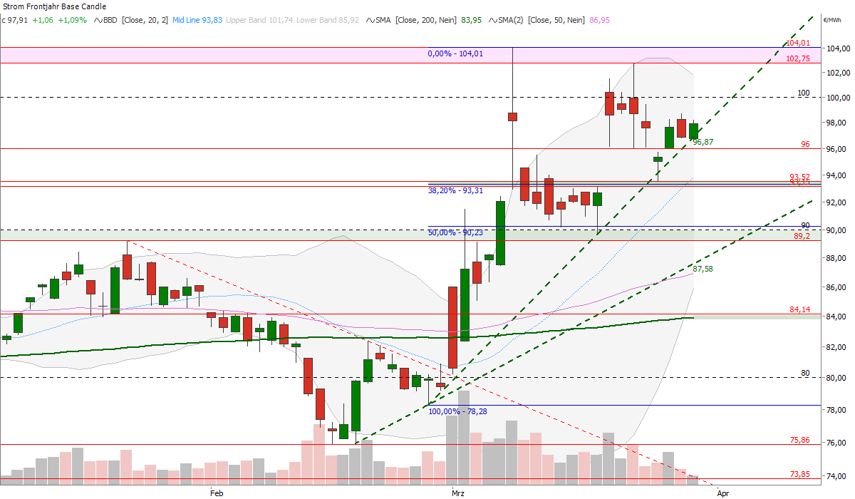 Der Strom Cal 27 Base Future hat sich seit dem Jahrestief Mitte Februar bei 75,86 Euro/MWh in einer ausgeprägten Rally bis zum Jahreshoch vom 9. März bei 104,10 Euro/MWh um rund 37 Prozent verteuert. In dieser Aufwärtsbewegung wurden mit hoher Dynamik zunächst die 200‑Tage‑Linie bei 83,15 Euro/MWh sowie anschließend der seit Februar 2025 mehrfach bestätigte Widerstandsgürtel bei 88–90 Euro/MWh nach oben durchbrochen. Nach Überschreiten der psychologischen 100‑Euro‑Marke kam es jedoch zu einem Rücklauf an die letzte Ausbruchsmarke. Am Freitag fiel der Future intraday bis an die Zone um 90 Euro/MWh zurück, wo erneut Kaufinteresse einsetzte. Auffällig ist, dass die jüngsten roten Tageskerzen von rückläufigem Volumen begleitet werden und das MACD‑Histogramm fallend ist, ein Hinweis auf nachlassendes Aufwärtsmomentum. Der RSI hat zudem ein Ausstiegssignal generiert, was auf eine zunehmende Korrektur-Chance hindeutet. Charttechnisch bleibt der Bereich um 90 Euro/MWh vorerst als wichtiger Support intakt. Bearish wäre ein Bruch unter 89,2 Euro/MWh zu werten. Damit fiele der Preis unter das 50%‑Fibonacci‑Retracement (90,23 Euro/MWh) und würde zugleich den grün gestrichelten Aufwärtstrend verletzen, was Rückschläge in Richtung 87,26 Euro/MWh (61,8%‑Retracement) und 84 Euro/MWh (ehemalige Polaritätswechselzone) begünstigen würde. Auf der Oberseite wäre ein Anstieg über das jüngste Reaktionshoch bei 95,5 Euro/MWh ein neues Bestätigungssignal für die Bullen. In diesem Fall dürfte die 100‑Euro‑Marke wieder verstärkt in den Fokus rücken.