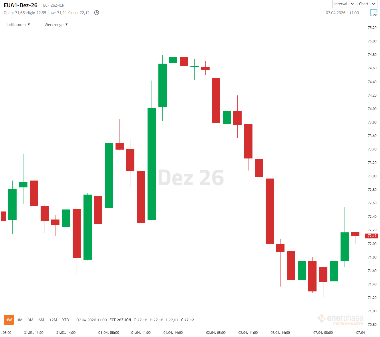 Die CO2-Zertifikate gingen am gestrigen Dienstag mit einem Plus von 0,5 Prozent bei 71,67 Euro/t CO2 aus dem Handel. Der EUA-Dezember-26-Future notiert am heutigen Mittwoch um 10:30 Uhr 1,1 Prozent fester bei 72,42 Euro/t CO2. Die Europäische Kommission hat den CBAM-Zertifikatspreis für das erste Quartal 2026 auf 75,36 Euro/t CO2 festgelegt. Grundlage ist ein volumengewichteter Durchschnitt der Emissionsauktionen. Der Mechanismus betrifft CO2-intensive Importgüter wie Stahl, Zement und Wasserstoff und soll die CO2-Kosten zwischen europäischen Produzenten und Importen angleichen. Ab 2026 werden die Preise zunächst quartalsweise veröffentlicht. Ab 2027 ist eine wöchentliche Preisfestlegung sowie ein zentraler Zertifikathandel vorgesehen. Der CBAM gilt als zentrales Instrument zur Begrenzung von Carbon Leakage und zur Stabilisierung der europäischen Klimapolitik.