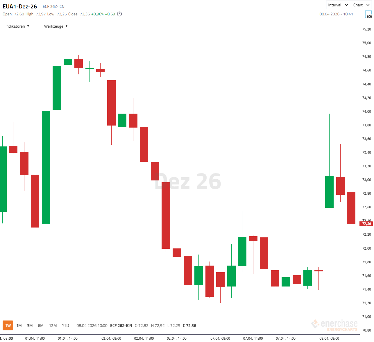 Die CO2-Zertifikate beendeten den gestrigen Donnerstag mit einem Plus von 2,6 Prozent bei 73,71 Euro/t CO2. Der EUA-Dezember-26-Future handelt am heutigen Freitag um 10:30 Uhr 0,5 Prozent leichter bei 73,36 Euro/t CO2. Die gestern veröffentlichten vorläufigen Emissionsdaten der EU-Kommission (Verified Emission) zeigen auf den ersten Blick einen deutlichen Emissionsrückgang im EU-ETS. Die Emissionen im europäischen Emissionshandelssystem sind 2025 demnach für rund 9.800 Anlagen um 9 Prozent auf rund 1.077 Millionen Tonnen CO2-Äquivalent gesunken. Allerdings haben noch nicht alle Anlagen gemeldet. Bereinigt um fehlende Meldungen wird der tatsächliche Rückgang auf 1,3 bis 1,5 Prozent geschätzt.