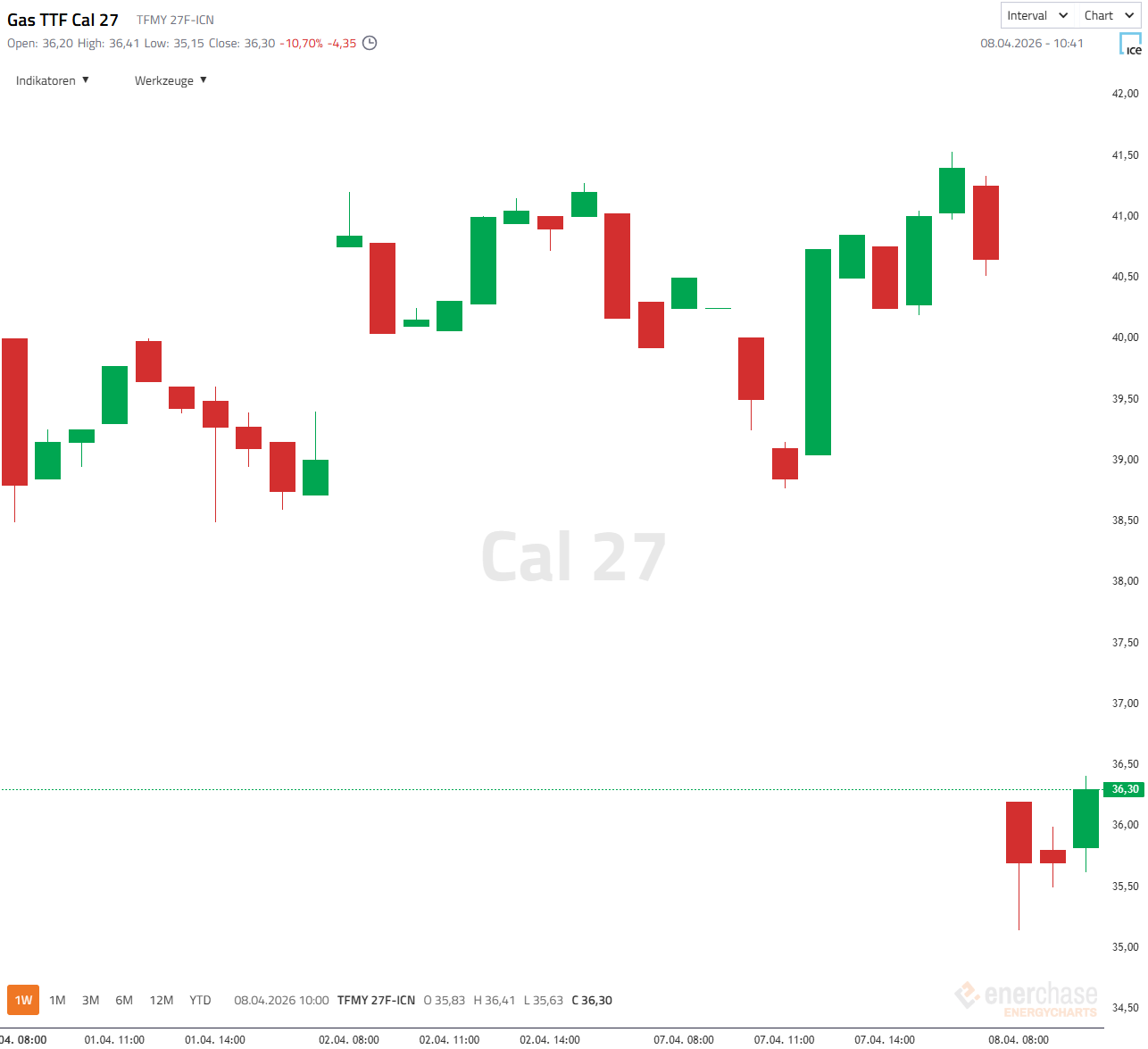 Das TTF Gas Frontjahr ging am gestrigen Mittwoch mit einem Minus von 9,7 Prozent bei 36,71 Euro/MWh aus dem Handel. Das TTF Gas Cal 27 notiert am heutigen Donnerstag um 10:00 Uhr 3,1 Prozent fester bei 37,85 Euro/MWh. Für den LNG-Markt, und damit für die europäischen Gaspreise, bedeutet die aktuelle Lage, dass auch bei einer Wiederaufnahme der Durchfahrten durch die Meerenge die Betreiber der Gasverflüssigungsanlagen in Katar und den Emiraten belastbare Sicherheit brauchen, bevor sie die Produktion hochfahren. Es wird allerdings auch berichtet, dass die seit Anfang März stillstehende LNG-Produktion in Ras Laffan in den kommenden Tagen schrittweise wieder anlaufen könnte. Die Ankündigung einer Waffenruhe erlaubt es dem Betreiber QatarEnergy, trotz weiterhin anhaltender Angriffe erste Vorbereitungen für eine Wiederaufnahme der Produktion zu treffen.