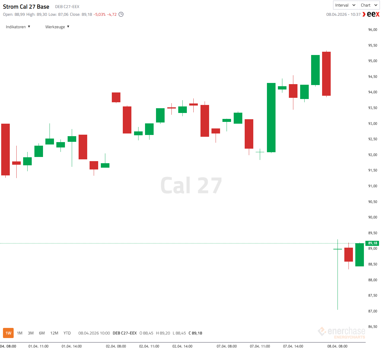 Am gestrigen Dienstag beendete das Strom Frontjahr Base den Handelstag mit einem Plus von 1,3 Prozent bei 93,90 Euro/MWh. Am heutigen Mittwoch um 10:20 Uhr notiert das Strom Cal 27 Base 5,6 Prozent schwächer bei 88,60 Euro/MWh. Die Windeinspeisung liegt ab morgen mit Werten zwischen 14 und 17 GW über dem langjährigen Mittel. Ab dem 13.4. werden jedoch wieder unterdurchschnittliche Leistungen erwartet, voraussichtlich zwischen 7 und 12 GW, und damit unter dem langjährigen Mittelwert von 13,2 GW. Die PV-Einspeisung bleibt in den kommenden Tagen weiterhin erhöht. Ab dem 12.4. liegen die Prognosen jedoch nur noch bei 6 bis 9 GW und damit deutlich unter den Werten aus den gestrigen Modellläufen.