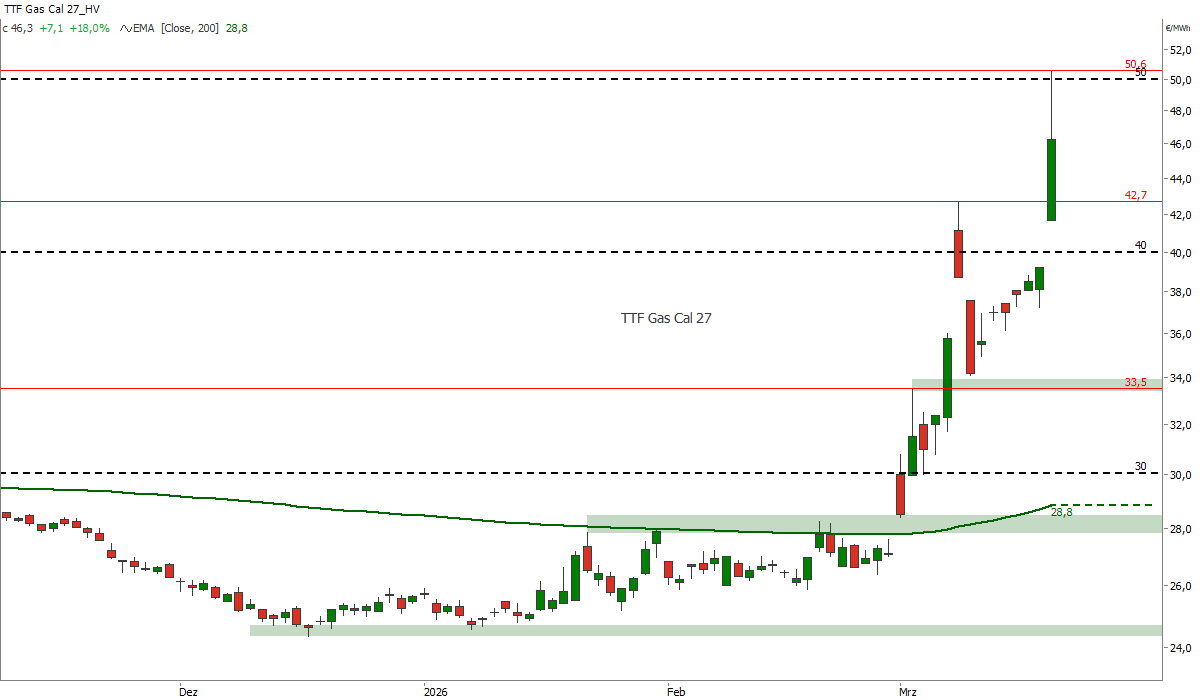 Der TTF Gaspreis für Cal 27 stieg am Donnerstag auf ein Hoch bei 50,6 Euro/MWh. Der Future prallte von der psychologischen 50-Euro-Marke ab und schloss bei 46,3 Euro/MWh. Das Hoch vom 09.03. bei 42,7 Euro/MWh bietet einen ersten Support, auf welchem Risiken aus dem Gasportfolio genommen werden könnten. Darunter ist die psychologische 40-Euro-Marke relevant. Ein Preisanstieg auf neue Hochs lässt den panikartigen Aufwärtstrend weiter fortbestehen. Insbesondere ein Anstieg auf Tagesschlusskursbasis über 50 Euro/MWh könnte vom Markt bullish interpretiert werden.