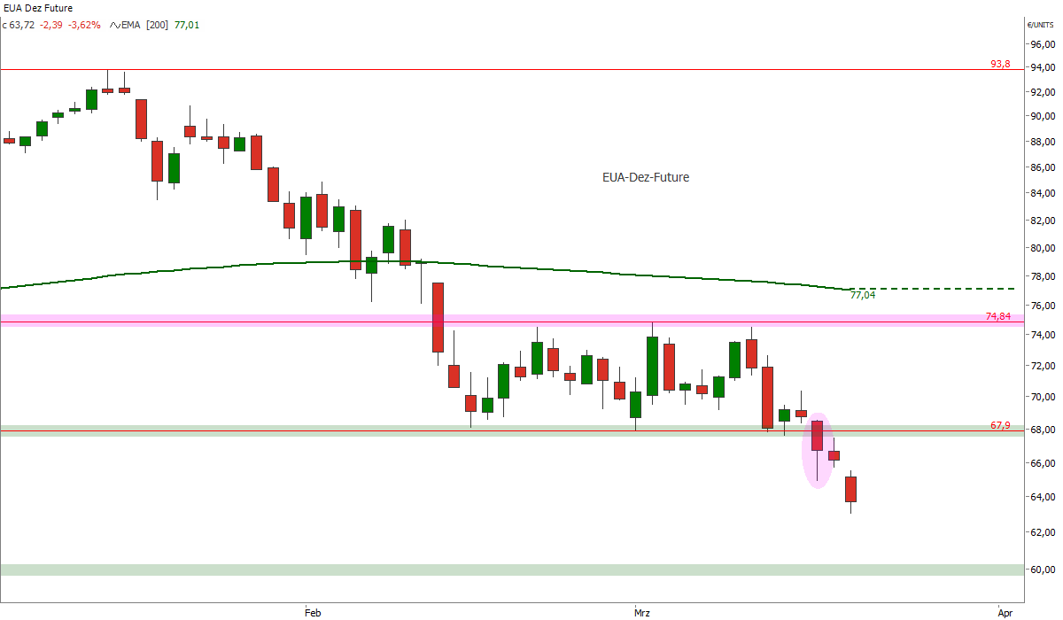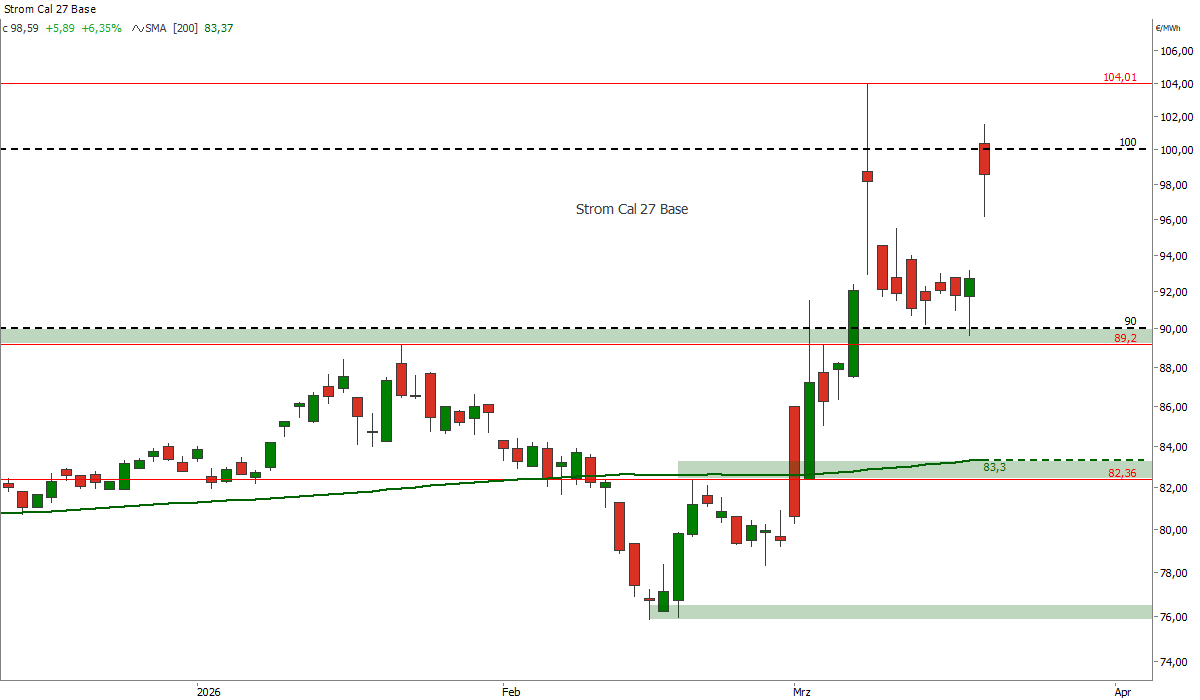 Das Strom Frontjahr Base stieg am Donnerstag auf ein Tageshoch bei 101,5 Euro/MWh. Der Future prallte jedoch von der psychologischen 100-Euro-Marke ab und schloss bei 98,59 Euro/MWh. Auf der 90-Euro-Marke befindest sich weiter ein starker Support, auf welchen Hedging-Aktivitäten aus charttechnischer Sicht sinnvoll erscheinen. Ein Tagesschlusskurs oberhalb von 100 Euro/MWh könnte vom Markt bullish interpretiert werden. Das aktuelle Rallyhoch vom 09.03. befindet sich bei 104,01 Euro/MWh. Aufgrund der schwachen EUA-Preise hat der Strom Future im Gegensatz zu Gas bislang kein neues Trendhoch ausgebildet.