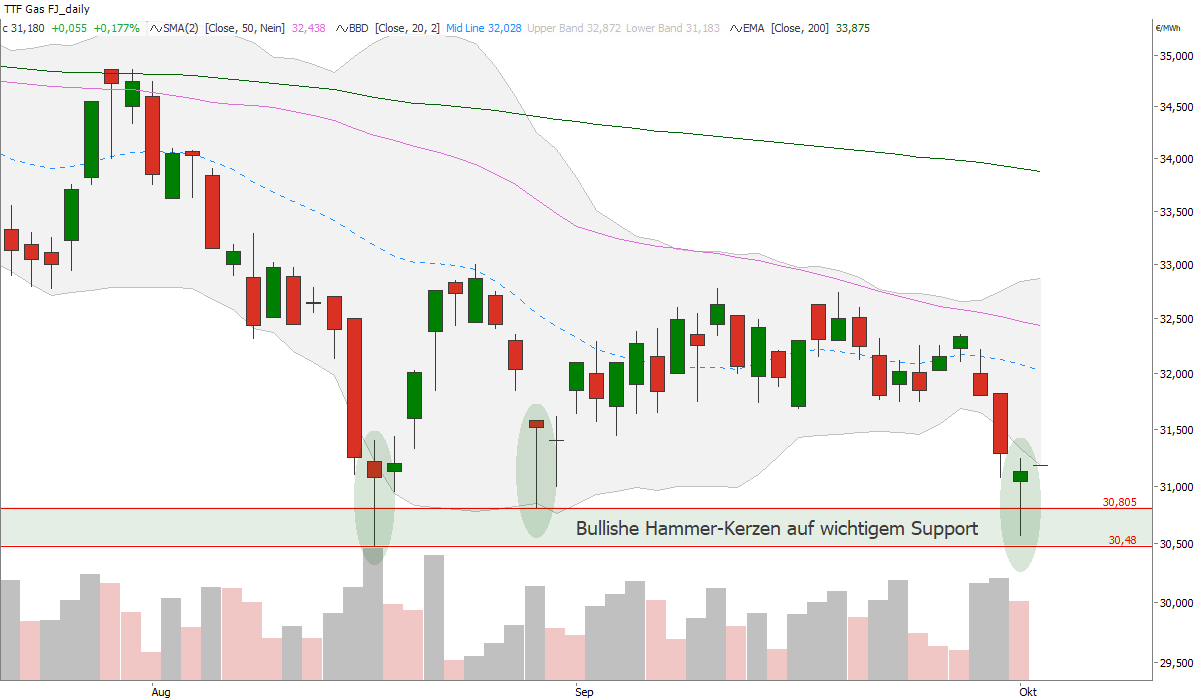Nach dem Preisrutsch der letzten Tage fielen die Gaspreise entlang der Kurve auf charttechnisch und psychologisch relevante Supports. Das TTF Gas Frontjahr fiel bis auf die Augusttiefs bei 30,60 Euro/MWh zurück und es kam zur Ausbildung einer bullishen Hammer-Kerze. Gashändler dürften dies als „Buy the Dip“ Moment interpretieren, wodurch es kurzfristig zu steigenden Preisen kommen könnte.