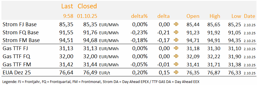 Für heute zeigen wir uns aufgrund von charttechnischen Kaufsignalen (Hammer-Kerzen bei Gas und Strom, sowie Bärenfalle bei CO2) bullish gestimmt. Fundamental sieht der Markt allerdings weiter entspannt aus.