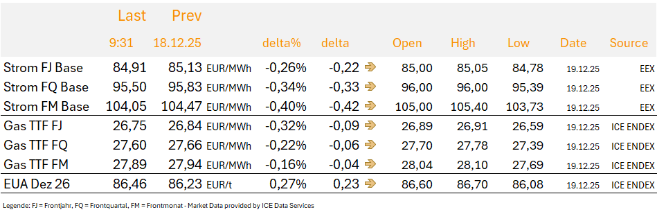 Die EU hat sich auf eine Finanzhilfe von 90 Milliarden Euro für die Ukraine in den kommenden zwei Jahren geeinigt, finanziert über einen Kredit der EU-Kommission. Die Rückzahlungspflicht für die Ukraine gilt nur, wenn Russland in Zukunft Reparationen leistet. Die in der EU eingefrorenen russischen Staatsguthaben in Höhe von rund 210 Milliarden Euro bleiben daher weiterhin blockiert. Kanzler Merz sprach von einer stabilen Finanzierung für Kiew und einem klaren Signal an Moskau. Für den Energiemarkt bedeutet dies, dass eine Verhandlungslösung wahrscheinlicher geworden ist. Daher sehen wir dies als bearishes Signal, denn die Aufhebung von Sanktionen gegen den russischen Energiesektor könnte Teil dieser Verhandlungen sein. Am Freitag und Samstag gehen die Verhandlungen zwischen der Ukraine und den USA in Miami weiter. Heute wird der russische Präsident Putin sein jährliches großes TV-Interview geben.