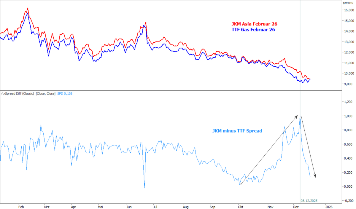 Angesichts der anhaltenden Schwäche des asiatischen JKM LNG-Preises und der Stabilisierung am kurzen Ende bei TTF Gas ist der TTF-JKM-Spread deutlich zusammengelaufen und liegt für den Februar-26-Future aktuell bei 0,14 US-Dollar/MMBtu (Settlementpreis vom 18. Dezember).