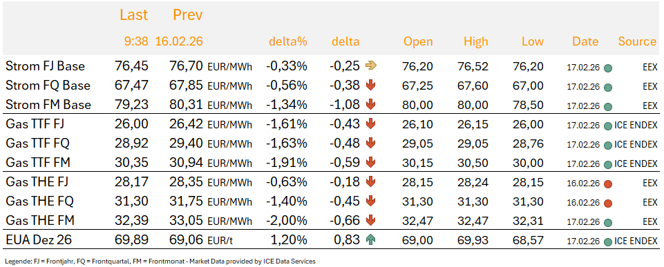 Am Dienstag geht es an den Energiemärkten bislang weiterhin nach unten. Mildere und windigere Prognosen für die nächsten Tage können der Grund sein. Allerdings scheint es sich nur um ein kurzes milderes Intermezzo zu handeln, bevor die Werte laut Langfristprognosen wieder in den unterdurchschnittlichen Bereich fallen und dort bis Ende März verbleiben. Norwegen steuert allmählich auf die Wartungssaison zu, das Angebot ist leicht verringert und wird in den kommenden Wochen weiter reduziert.