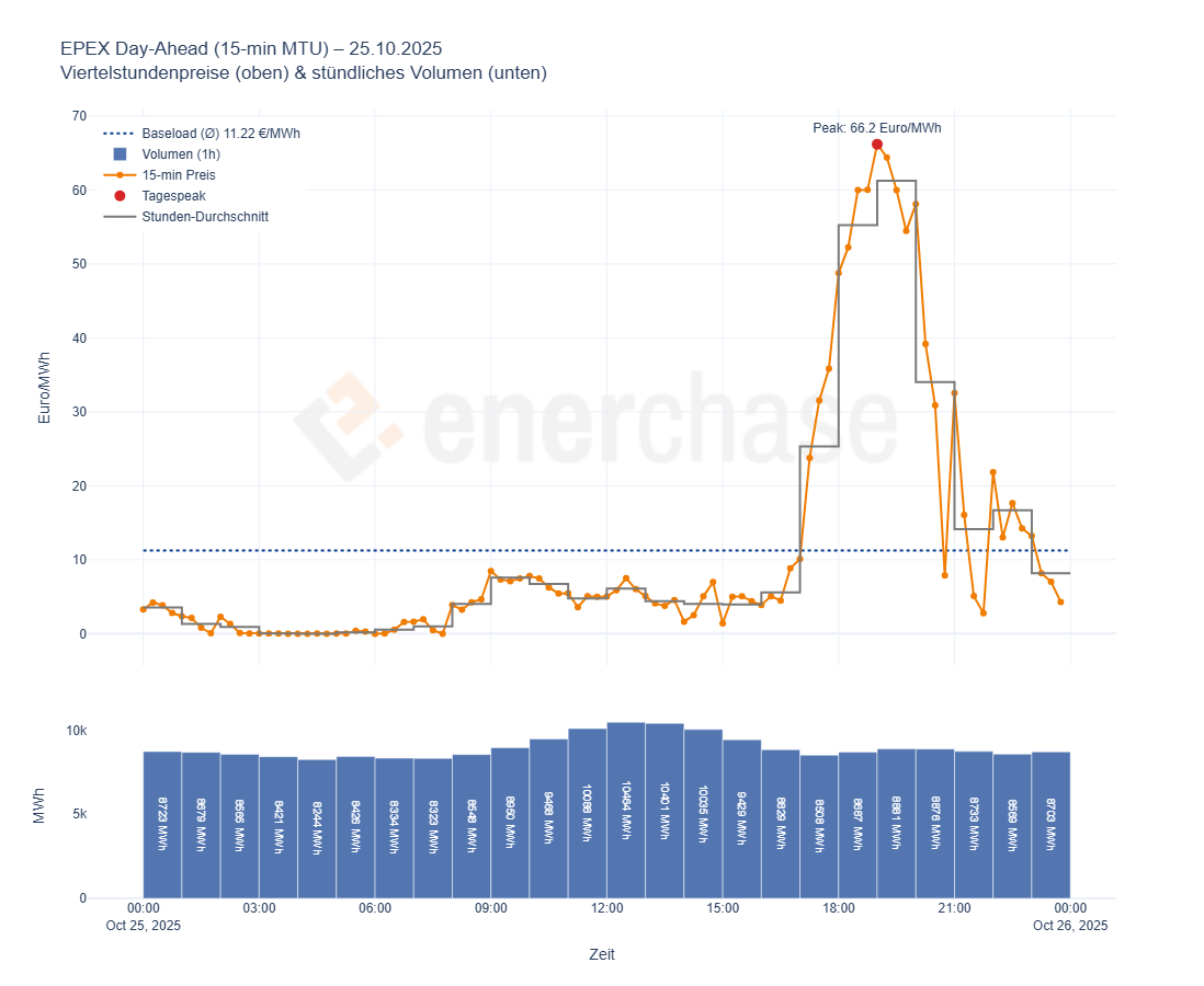 Die heutige Day-Ahead-Auktion für Freitag, den 24. Oktober, markiert den ersten Werktag im Oktober mit negativen Stundenpreisen seit Einführung der 15-Minuten-Zeitschritte. Der Markt preist ein Überangebot aus Wind konsequent ein: Baseload 32,32 Euro/MWh, Peakload 42,38 Euro/MWh, Tagesminimum −0,02 Euro/MWh (13:00 bis 14:30 Uhr), Tagesmaximum 88,96 €/MWh. Parallel dazu zieht das geclearte Volumen deutlich an: 909.101 MWh für den Liefertag, +14 Prozent gegenüber Donnerstag. Innerhalb des Tages konzentriert sich die Liquidität auf die EE-Spitze: Zwischen 12 und 18 Uhr werden im Schnitt 10.953 MWh/h gehandelt, rund 24 Prozent mehr als am Abend (Ø 8.851 MWh/h). Der statistische Fingerabdruck passt: Preis und Volumen sind mittags nahezu perfekt gegenläufig. Negativ wurde es stündlich zwischen 13:00 und 15:00 (−0,01 Euro/MWh). In den Viertelstunden erstreckte sich der Null- und Negativbereich von 12:00 bis 15:00 Uhr. Spiegelbildlich dazu stehen sehr günstige Nachtstunden von 01:00 bis 05:00 Uhr mit einem Mittel von 5,42 Euro/MWh.