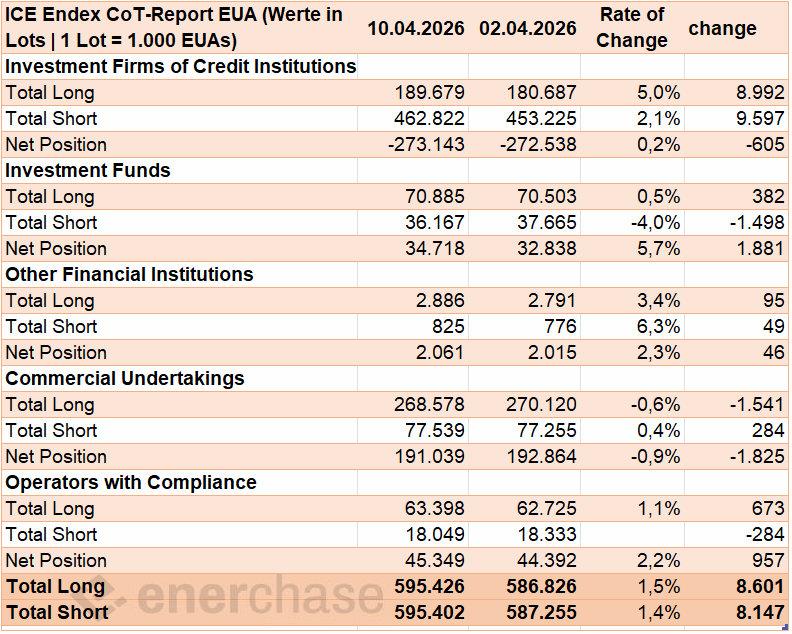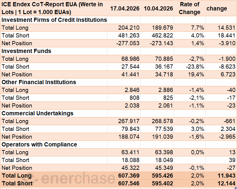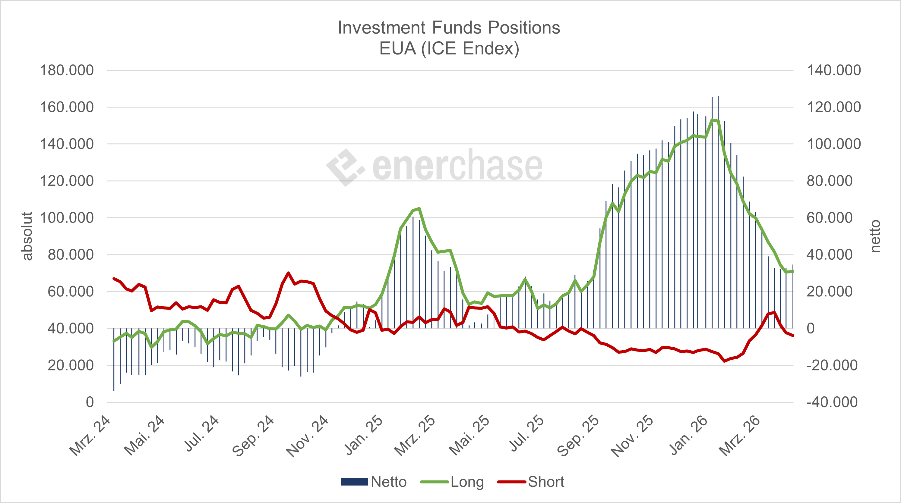 Der EUA-Dez-26-Future legte in der Berichtswoche zum 17. April 2026 um 5,5 Prozent zu. Getrieben wurde der Anstieg auch durch einen Short-Abbau der Investmentfonds. Dieser führte dazu, dass die Netto-Long-Position um 6,7 Mio. EUA auf 41,4 Mio. EUA anstieg. Das entspricht einem Zuwachs von 19,4 Prozent gegenüber der Vorwoche und ist das höchste Niveau seit mehreren Wochen.