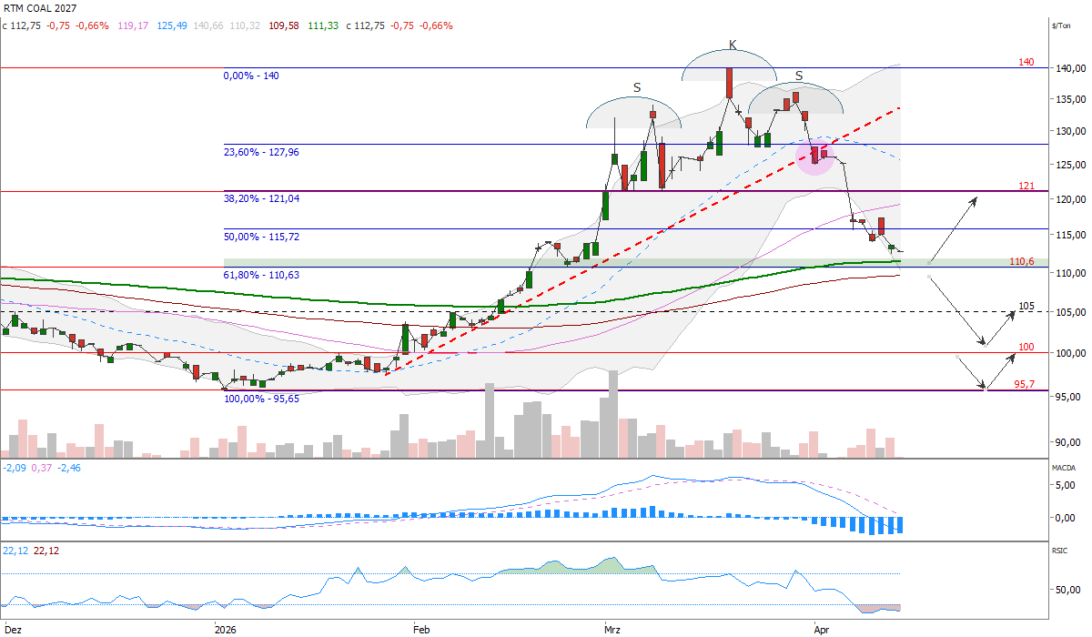 Der API#2 Kohle‑Future Cal 27 verzeichnete seit Jahresbeginn 2026 ausgehend vom Tief bei 95,65 USD/t eine beeindruckende Rally bis auf ein Trendhoch von 140 USD/t am 19. März. Der Kursanstieg betrug rund 46 Prozent innerhalb weniger Wochen. Damit überwand der Kontrakt sämtliche relevante gleitende Durchschnitte und etablierte einen steilen Aufwärtstrend (rot gestrichelt). Nach Ausbildung des Hochs gelang jedoch keine Fortsetzung der Rally. Am 30. März wurde lediglich ein tieferes Verlaufshoch markiert, und Anfang April fiel der Future unter das 23,6%-Fibonacci-Retracement sowie unter das mittlere Bollinger Band (125,5 USD/t) und den rot gestrichelten Aufwärtstrend. Damit wurde gleichzeitig eine klassische Schulter‑Kopf‑Schulter‑Topformation bestätigt, ein starkes charttechnisches Umkehrsignal, das den anschließenden Verkaufsdruck begründete. Am 15. April nähern sich die Preise nun einer markanten Unterstützungszone im Bereich von 110–111 USD/t, wo das 61,8%‑Fibonacci‑Retracement der gesamten Aufwärtsbewegung (110,63 USD/t) mit der steigenden 200‑Tage‑Linie (111,33 USD/t) zusammenfällt. Der RSI befindet sich bereits im klar überverkauften Terrain, was eine technische Gegenbewegung begünstigt. Entscheidend ist nun das Auftreten bullischer Candlestick‑Umkehrsignale auf diesem Support-Cluster. Gelingt die Stabilisierung nicht und fällt der Kontrakt per Tagesschluss unter 110 USD/t, wäre simultan auch die 200‑Tage‑Linie unterschritten und ein weiterer Rückgang in Richtung 100 USD/t und 95,65 USD/t wahrscheinlich.