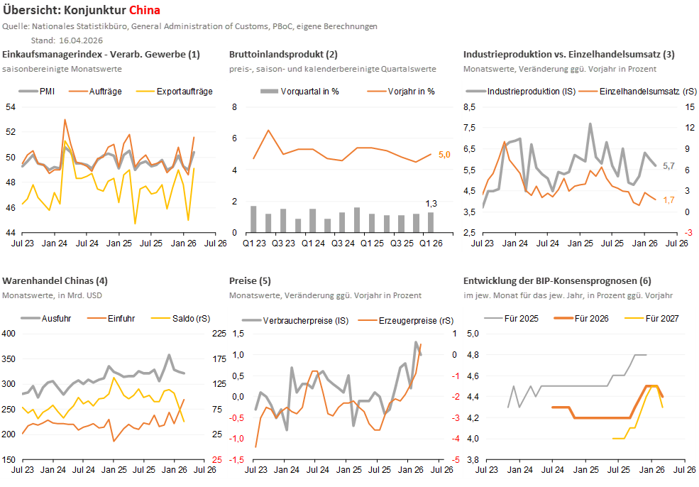Die heute zahlreich veröffentlichten Konjunkturdaten Chinas haben erneut überrascht. So expandierte das preis- und saisonbereinigte BIP im ersten Vierteljahr um 5,0% ggü. Vorjahr und übertraf damit die Konsenserwartungen um +0,2 Prozentpunkte. Das Gleiche galt für die Industrieproduktion, die im März um 5,7% ggü. Vorjahr (e: +5,5%) zulegte. Damit stieg diese im ersten Quartal im Jahresvergleich um merkliche 6,1%, was die anhaltende Bedeutung des Verarbeitenden Gewerbes als wichtigster Wachstumsmotor der Wirtschaft unterstreicht. Diese wurde auch anhand der Warenausfuhr deutlich, die in Q1 um 14,7% ggü. Vorjahr hochschnellte – das höchste Wachstum seit Anfang 2022. Etwas enttäuschend war dagegen das verhaltene Plus der Einzelhandelsumsätze in Höhe von 1,7% ggü. Vorjahr sowie der Anstieg der Arbeitslosenquote um 0,2 PP auf 5,4% jeweils für März.