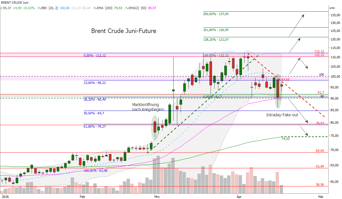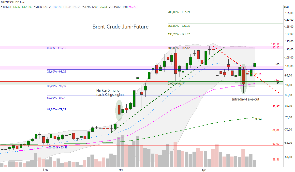 Der Brent‑Crude‑Juni‑Future befand sich von März bis Anfang April in einem dynamischen Aufwärtstrend oberhalb der grün gestrichelten Aufwärtstrendlinie. Das Trendhoch wurde am 19.03. bei 112,12 USD/bbl markiert, wo sich gleichzeitig das obere Bollinger‑Band (111,24 USD/bbl) befindet. Dieser Bereich stellt ein starkes Widerstandscluster dar, welches sich in den vergangenen Wochen als außerordentlich hartnäckig erwiesen hat und mehrfach erfolgreich verteidigt wurde.