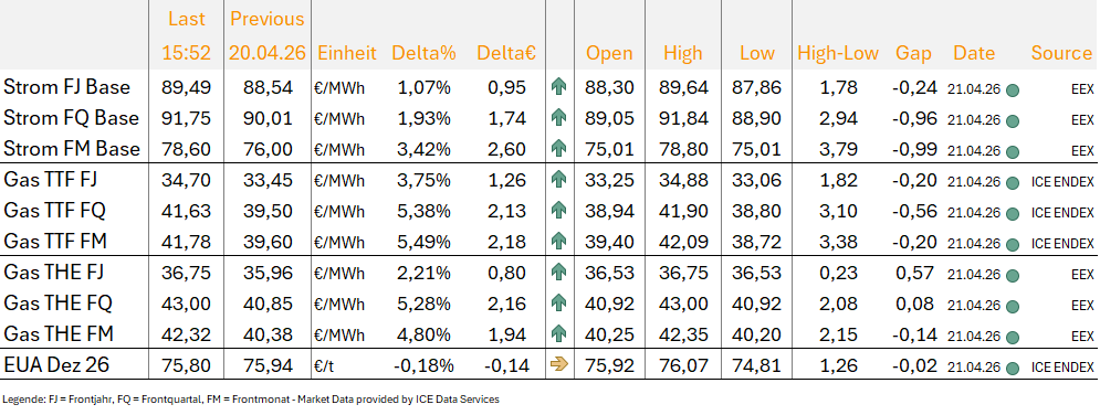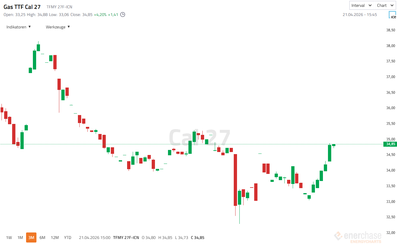 Nach dem stärkeren Verkaufsdruck zum Wochenausklang am Freitag starten die Energiemärkte die neue Handelswoche 17 mit spürbaren Aufschlägen. Der TTF Gas Frontmonat springt beispielsweise 2,66 Euro/MWh nach oben zur Eröffnung und notiert rund 4 Prozent fester. Am Freitag ließ die Ankündigung des Irans einer einseitigen Öffnung der Straße von Hormus für Handelsschiffe während der Waffenruhe die Öl- und Gaspreise noch deutlich einbrechen. Nun sind die wachsende Sorge vor einem Scheitern der Feuerpause ein erneuter Preistreiber: Die USA beschlagnahmten am Wochenende ein iranisches Frachtschiff, Teheran drohte mit Vergeltung und lehnte neue Verhandlungen in Islamabad ab.