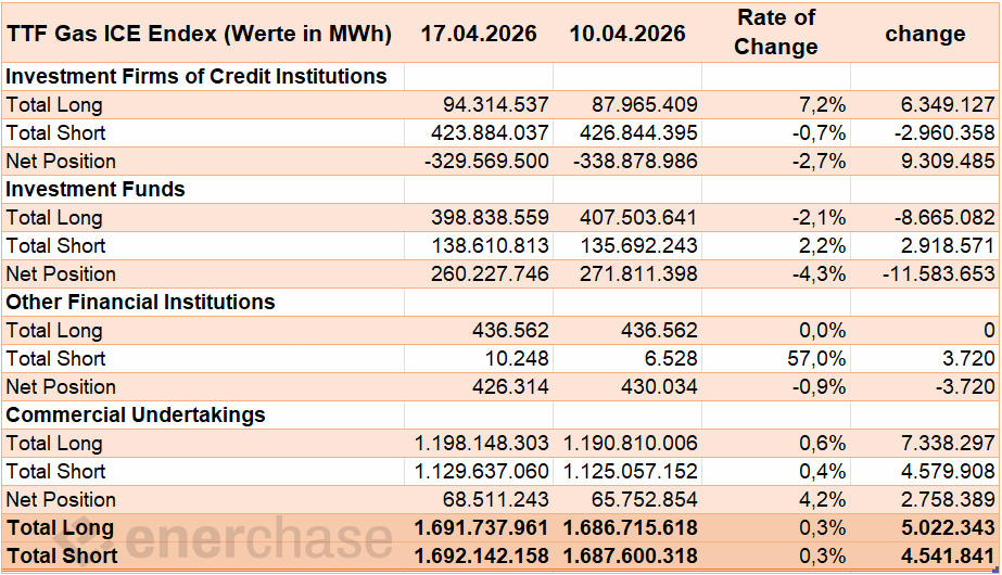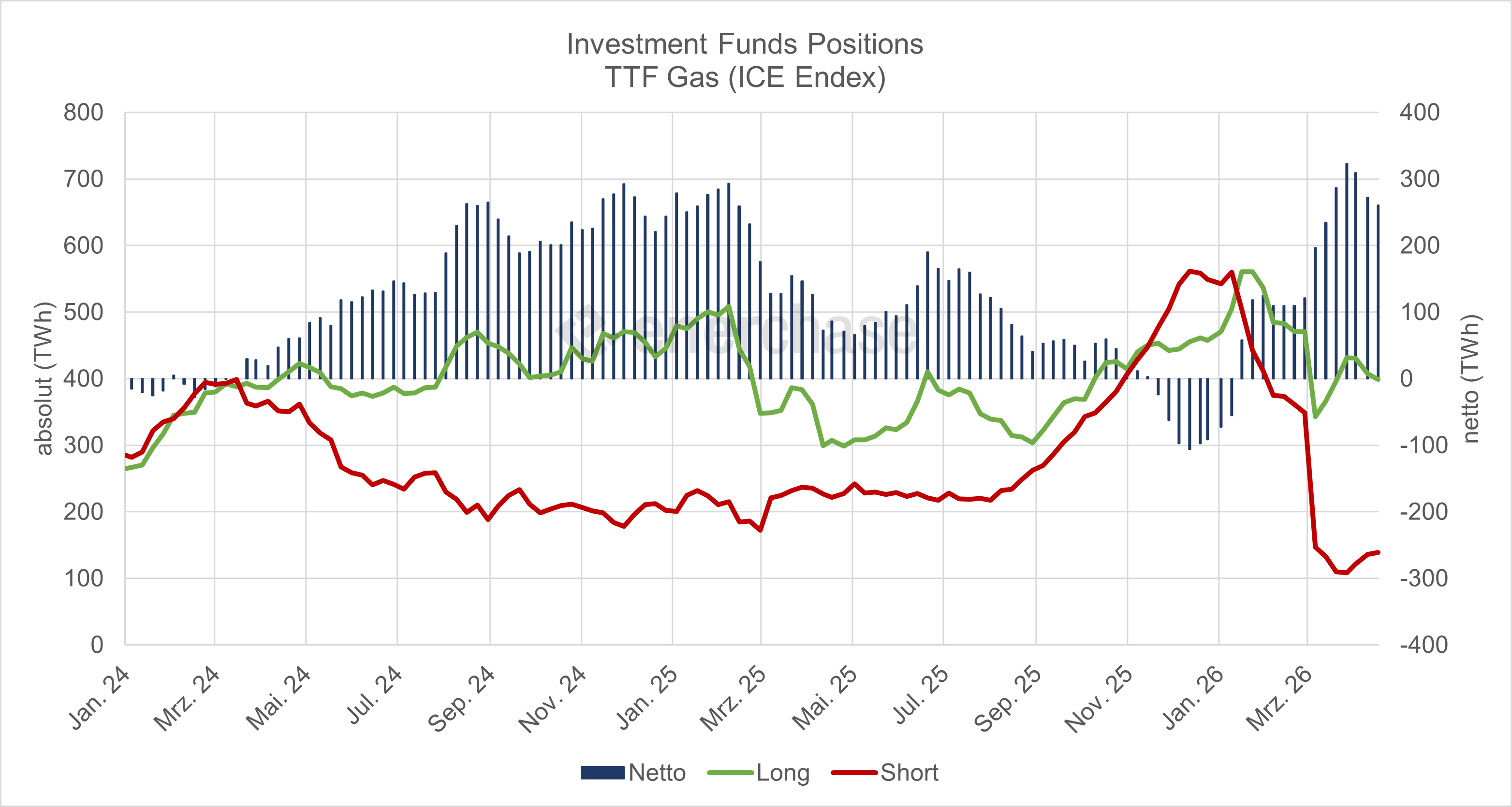 In der vergangenen Woche verlor das TTF Gas Frontjahr 6,8 Prozent. Der TTF Mai-26-Kontrakt gab sogar um 11,2 Prozent nach. Die Investmentfonds setzten den entsprechenden Netto-Long-Abbau der Vorwochen fort, mit einem Rückgang um 11,6 TWh auf 260,2 TWh (minus 4,3 Prozent). Das Ausmaß fällt im Vergleich zu der Preisbewegung jedoch relativ moderat aus.